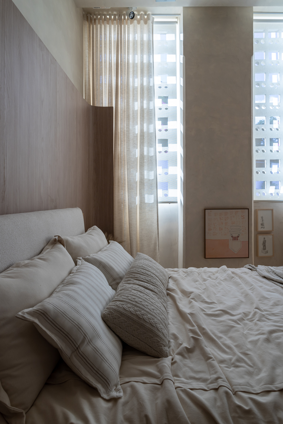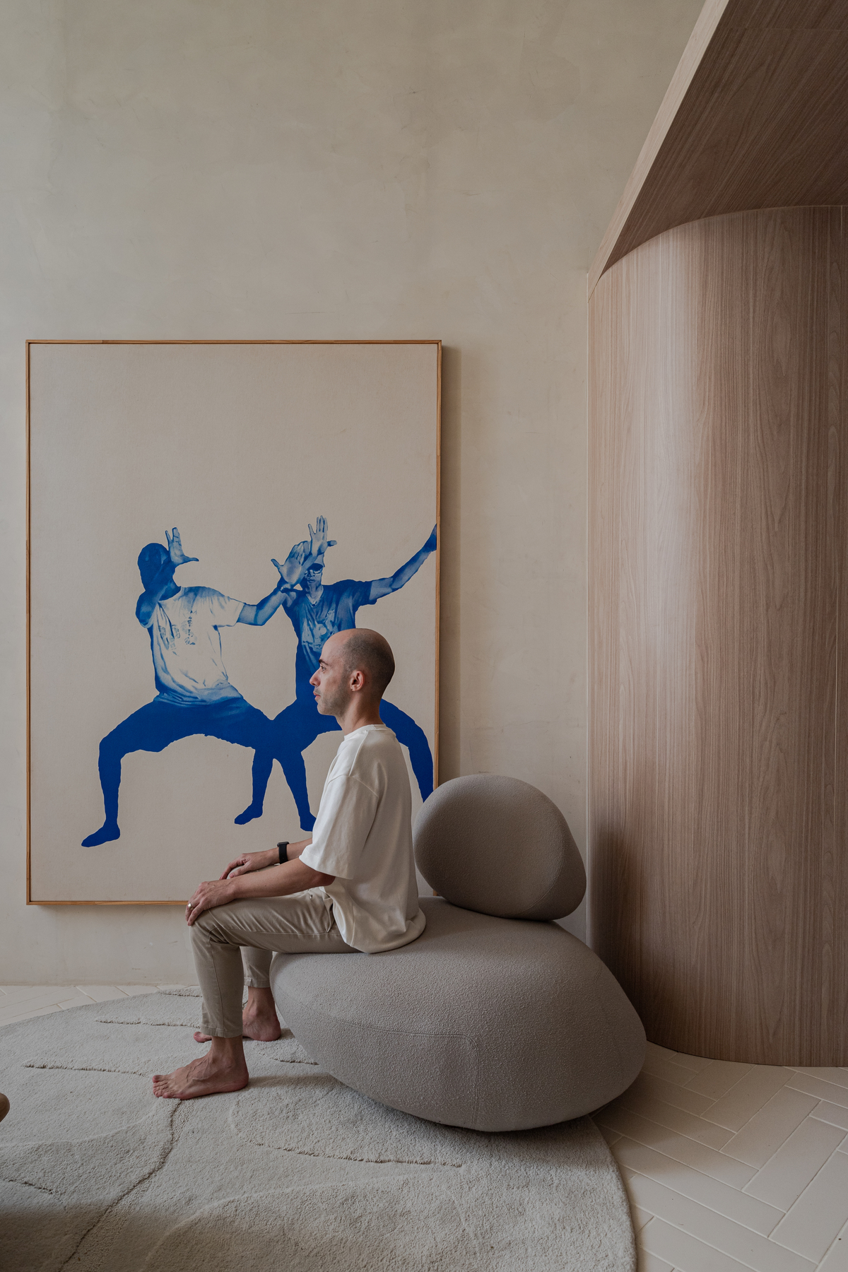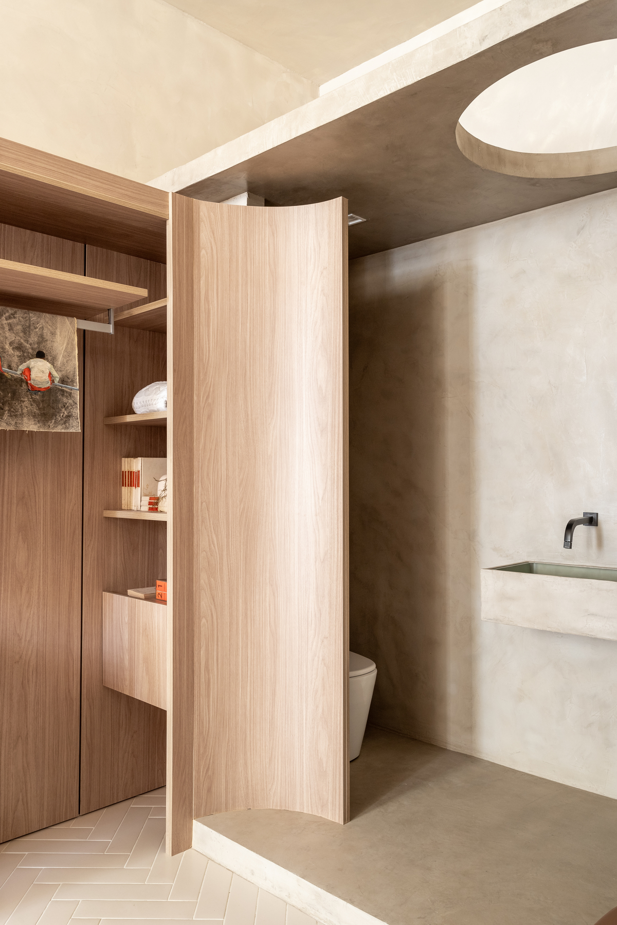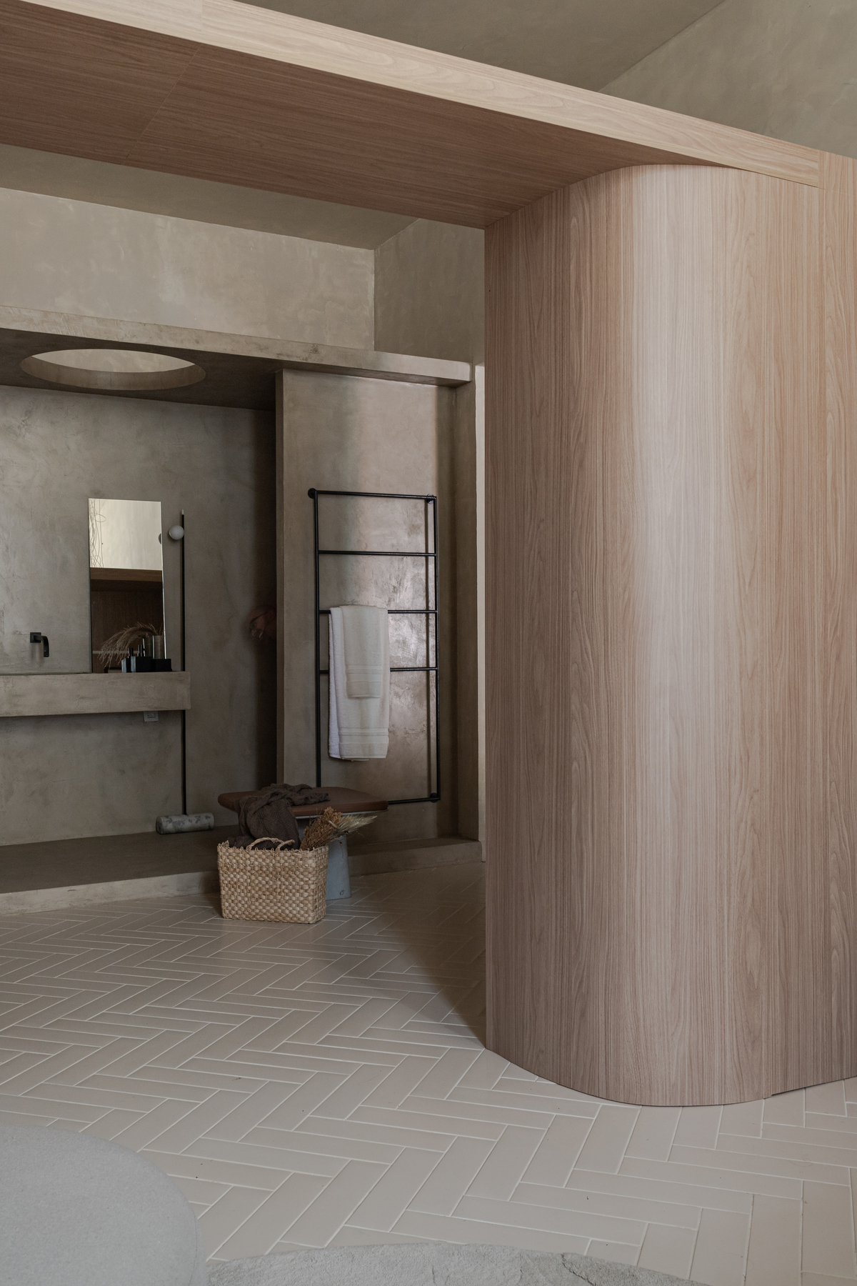 Um ambiente aberto, com fluidez de espaços e liberdade de movimentos. A estética suave e o domínio da arquitetura permitem o encontro das linhas retas com as formas curvas. Ao entrar no espaço é intuitiva a percepção da predominância dos tons neutros e de materiais acolhedores. Esta escolha propicia as diversas sobreposições de texturas encontradas nos tecidos, cortinas e móveis. A paleta de cores é neutra e reveste todas as superfícies do ambiente. As paredes e teto tem textura em cor de linho cru e o piso é de porcelanato natural, de mesmo tom. Assentado na forma de espinha de peixe, é ele que confere, através do chão, a textura de movimento em todo o espaço. A iluminação é difusa, suave, quase efêmera, de modo a criar uma sensação de transcendência. O conforto e o acolhimento são buscas constantes do projeto. São estes sentimentos que afagam, protegem e nos conectam com o nosso interior e permitem a elevação do pensamento.