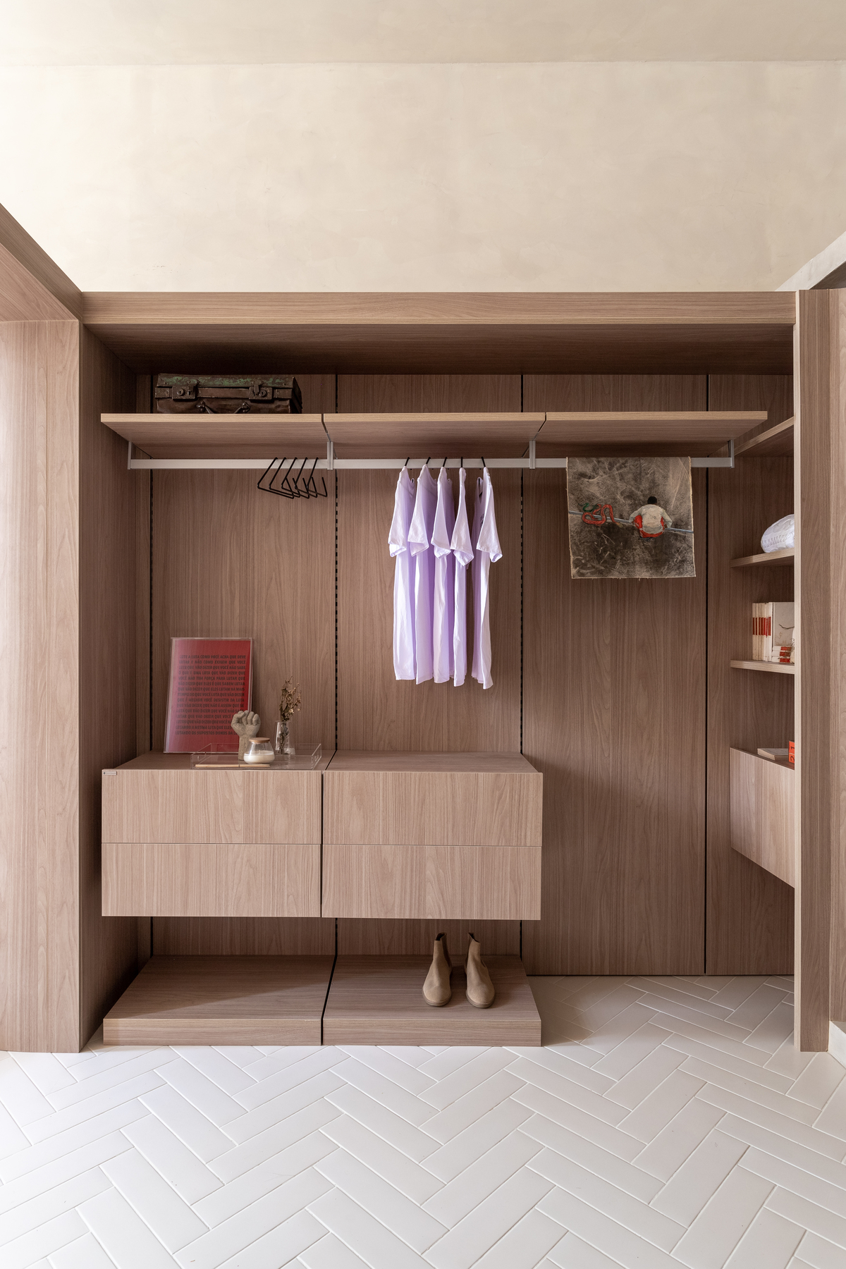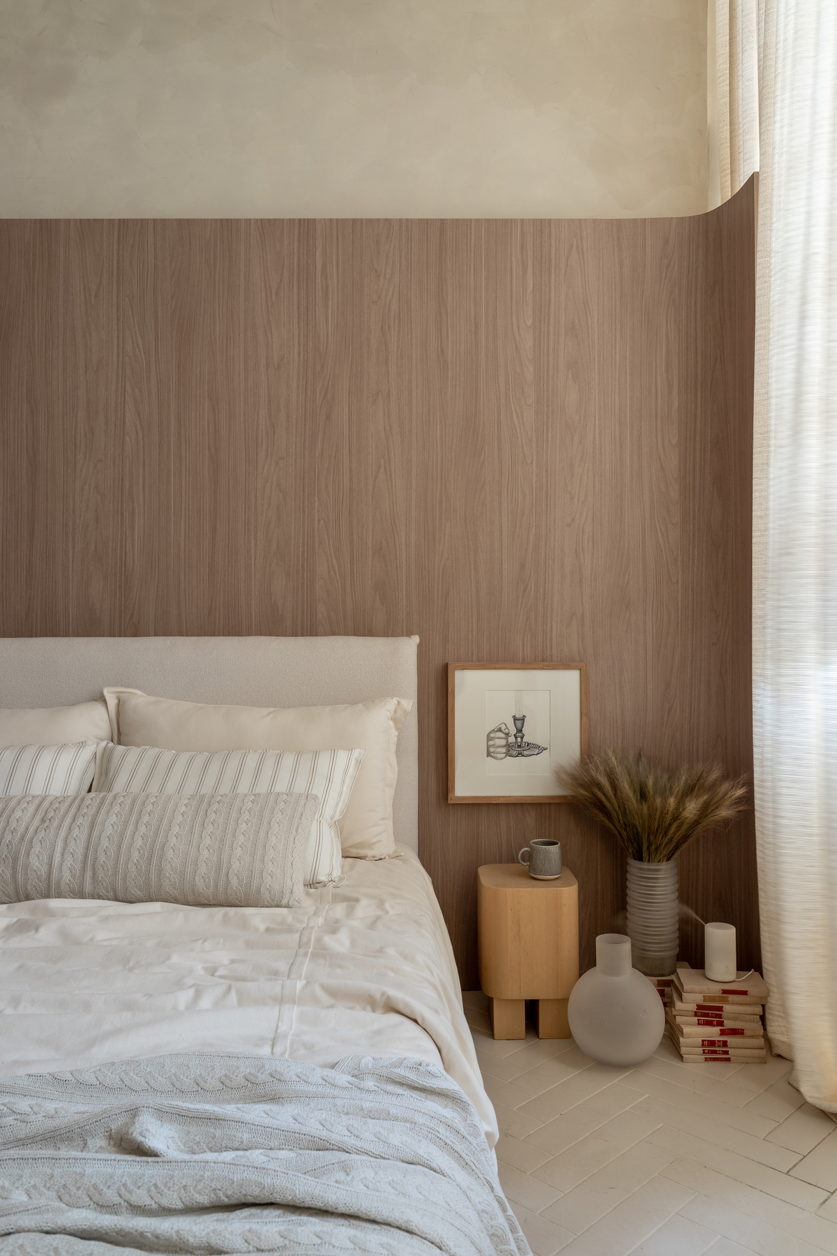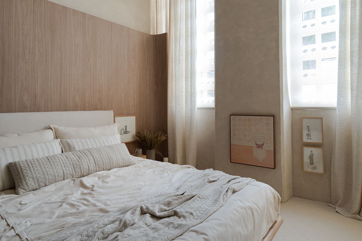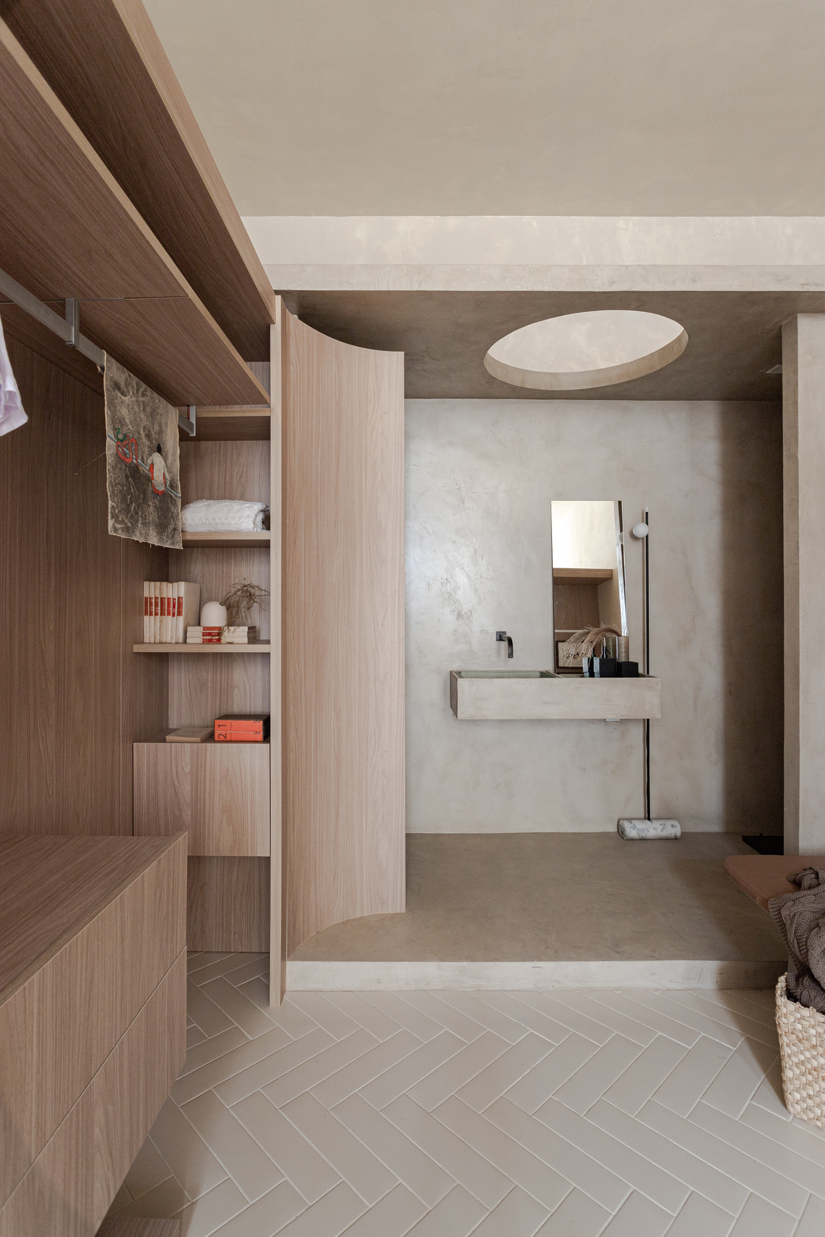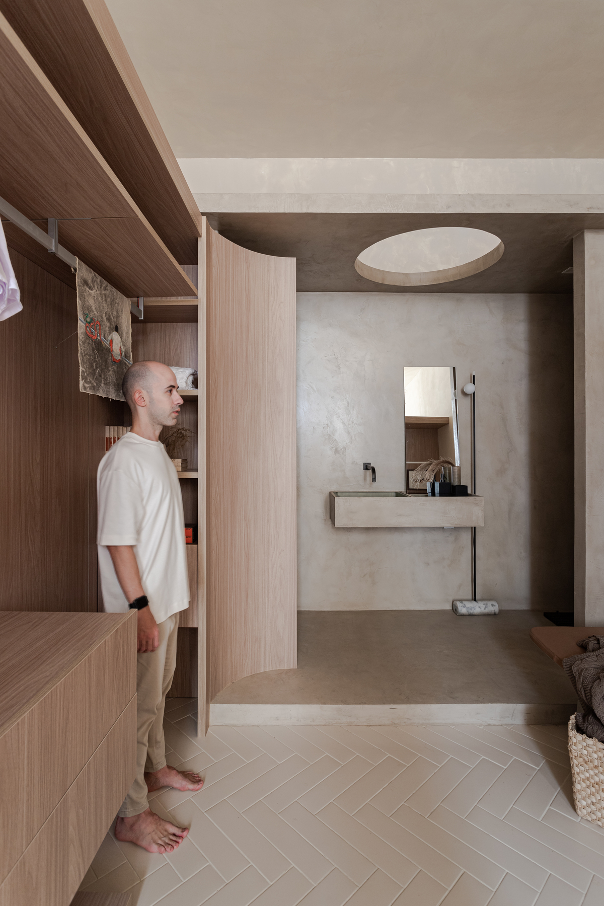 Um ambiente aberto, com fluidez de espaços e liberdade de movimentos. A estética suave e o domínio da arquitetura permitem o encontro das linhas retas com as formas curvas. Ao entrar no espaço é intuitiva a percepção da predominância dos tons neutros e de materiais acolhedores. Esta escolha propicia as diversas sobreposições de texturas encontradas nos tecidos, cortinas e móveis. A paleta de cores é neutra e reveste todas as superfícies do ambiente. As paredes e teto tem textura em cor de linho cru e o piso é de porcelanato natural, de mesmo tom. Assentado na forma de espinha de peixe, é ele que confere, através do chão, a textura de movimento em todo o espaço. A iluminação é difusa, suave, quase efêmera, de modo a criar uma sensação de transcendência. O conforto e o acolhimento são buscas constantes do projeto. São estes sentimentos que afagam, protegem e nos conectam com o nosso interior e permitem a elevação do pensamento.