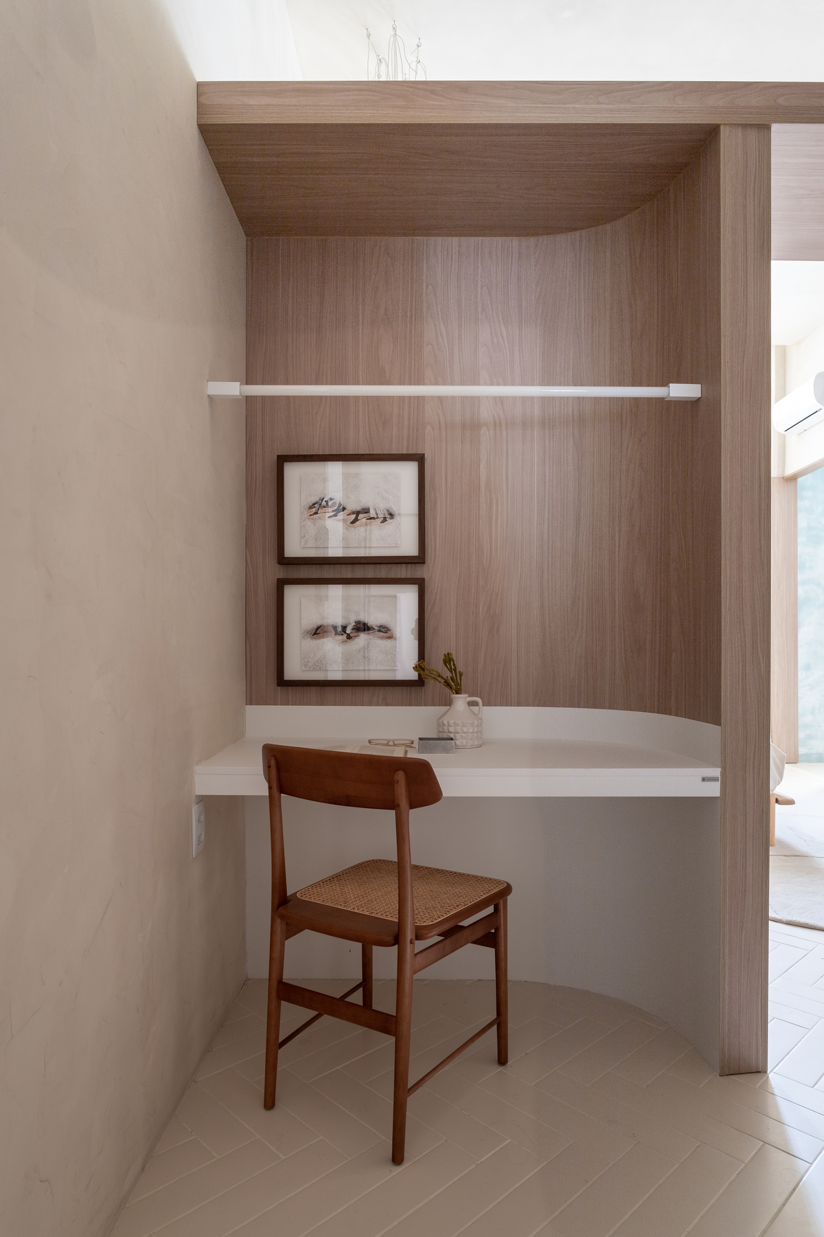 Na área de estudos, a cadeira Lucio, um clássico do designer Sérgio Rodrigues é o destaque de design, sem enjoar. Os móveis do espaço são poucos, mas todos com desenho autoral e brasileiros. Um ambiente leve, sensorial, contemporâneo na estética e jovem na essência. Pensado para ser vivido não apenas por aqueles que são jovens na idade, mas também para os que estão plenos na sua maturidade.