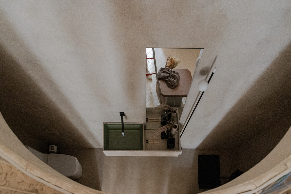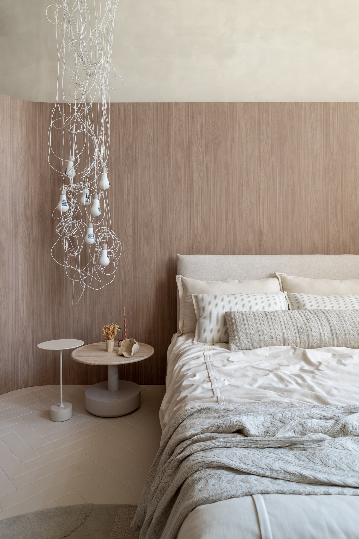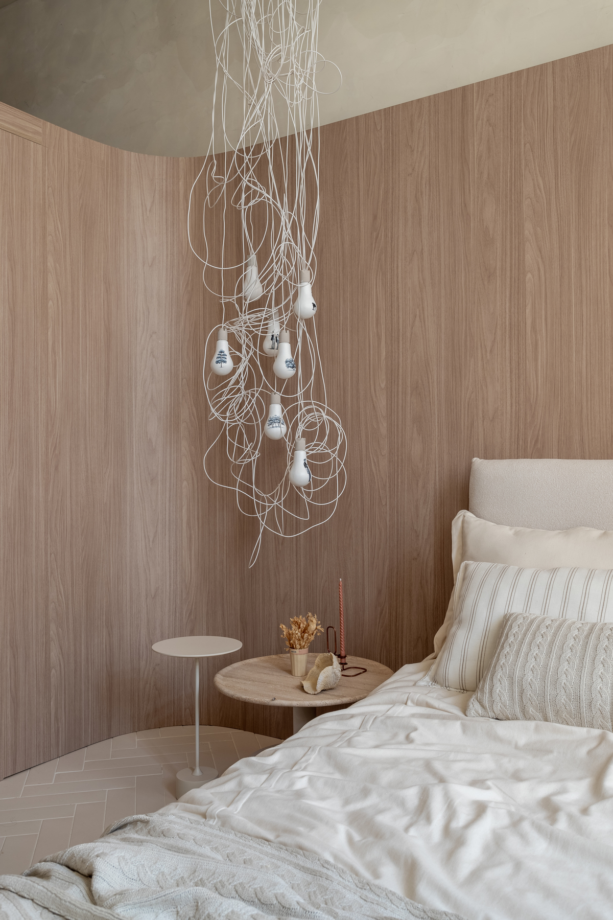 A arte está por toda parte. Uma instalação de lâmpadas da artista Ana Michaelis, juntamente com os castiçais (reais ou figurativos) nas laterais da cama, desenhada especialmente para o espaço, reforçam o pensamento iluminista do espaço. Em frente, a obra da série Tempo, do artista baiano Pedro Marighella, é o único ponto de cor em todo o espaço. Ainda tem Felipe Rezende, Milena Oliveira, Thiago Sant`ana e Renata de Bonis espalhadas pelo ambiente.